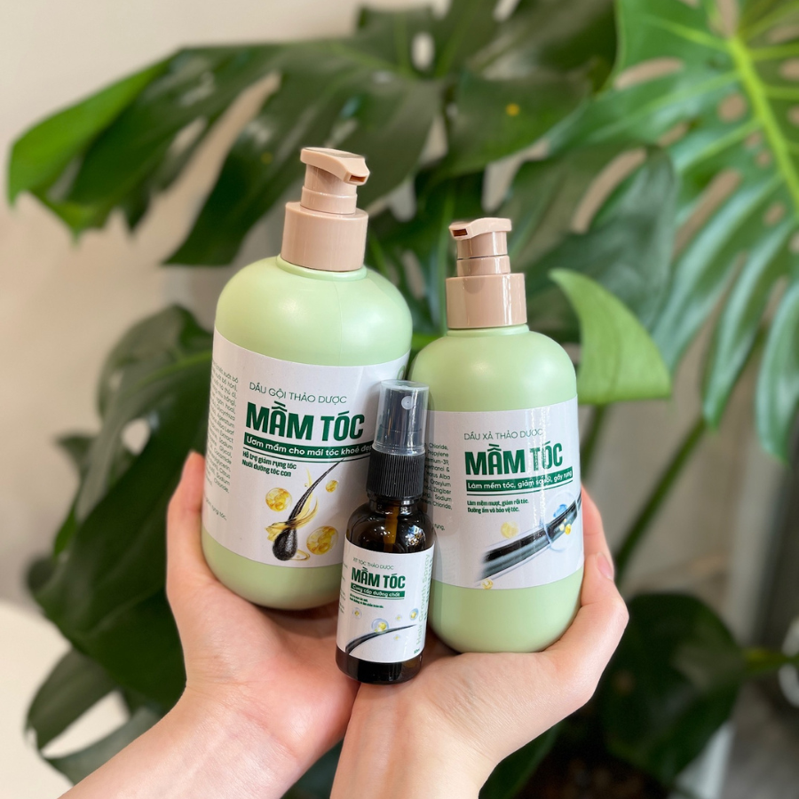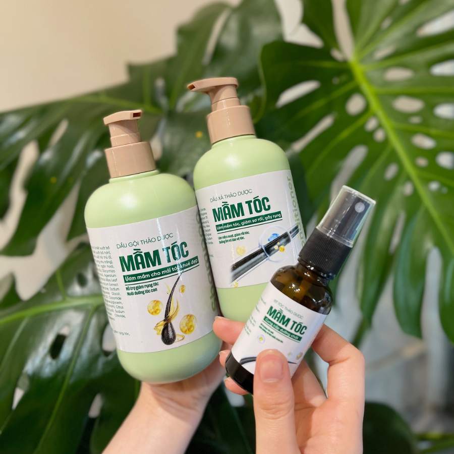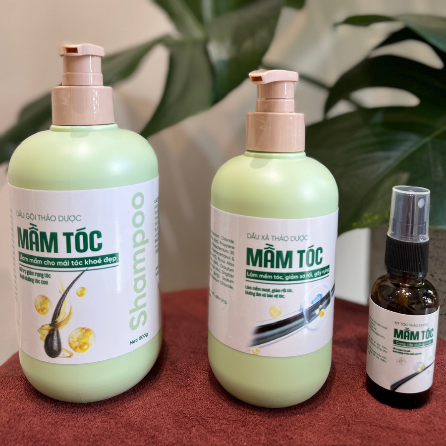 Bộ sản phẩm Mầm Tóc gồm dầu gội, dầu xả và xịt dưỡng, được thiết kế để chăm sóc mái tóc toàn diện, giúp tóc khỏe, mềm mượt và dễ vào nếp.